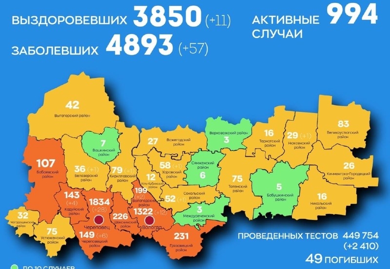 На сегодня в регионе 57 новых случаев инфекции: 28 – Череповец, 12 – Вологда, 6 – Череповецкий район, 4 – Кадуйский район, 2 – Вологодский район, по одному в Харовском, Сокольском, Белозерском, Нюксенском и Кирилловском районах. Количество обследованных составляет 449 754.