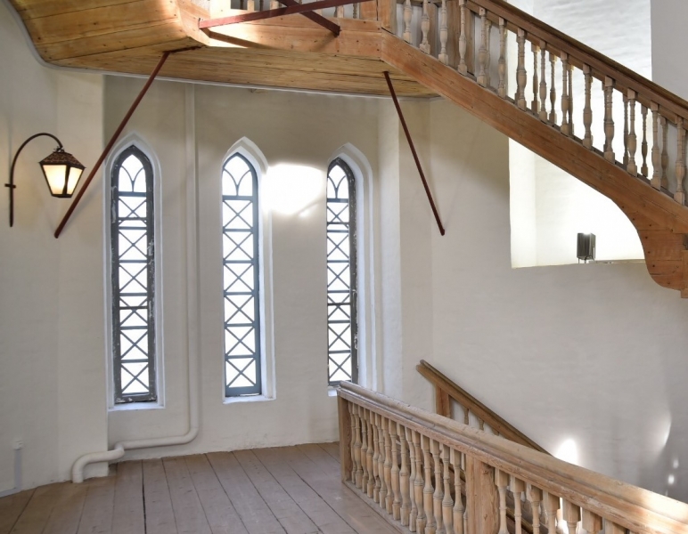 Это стало продолжением работ, которые провели здесь летом. Реставраторы побелили внутренние стены, заменили ветхие ступеньки и балясины винтовой лестницы, провели новую электрику и установили светильники.
