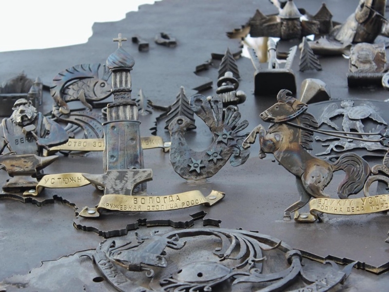 Кованая карта размером 4 на 10 метров весит около 15 тонн. Над ней трудились на протяжении года около 300 кузнецов из разных уголков России. Полотно собрали, как паззл, из кусочков-регионов. В центре разместили солнечные часы.