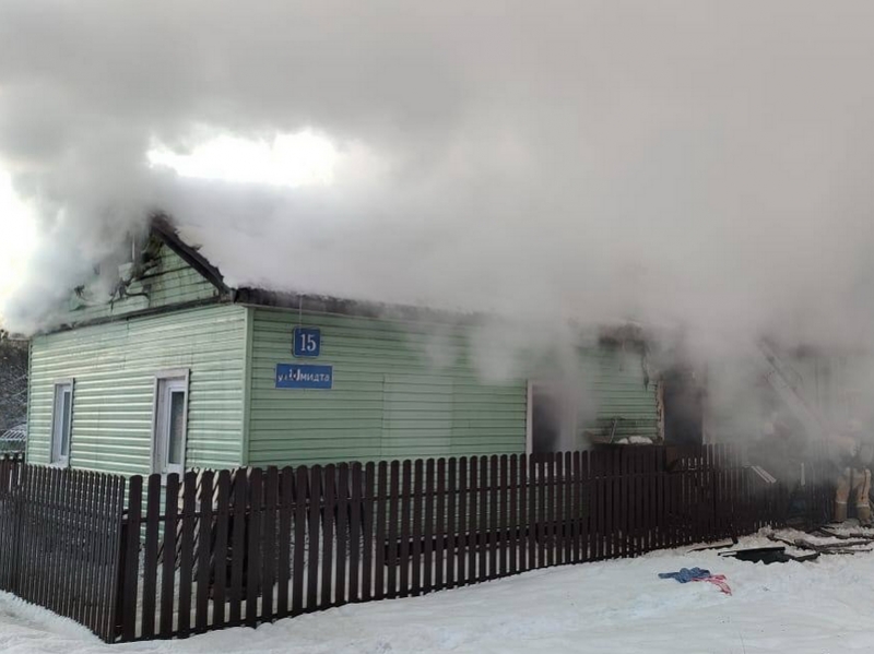 Дом сгорел сегодня на улице Шмидта, 15. Огонь уничтожил кровлю 3-квартирного деревянного дома. В нем проживали 4 человека, с ними эвакуировали 9 гостей.