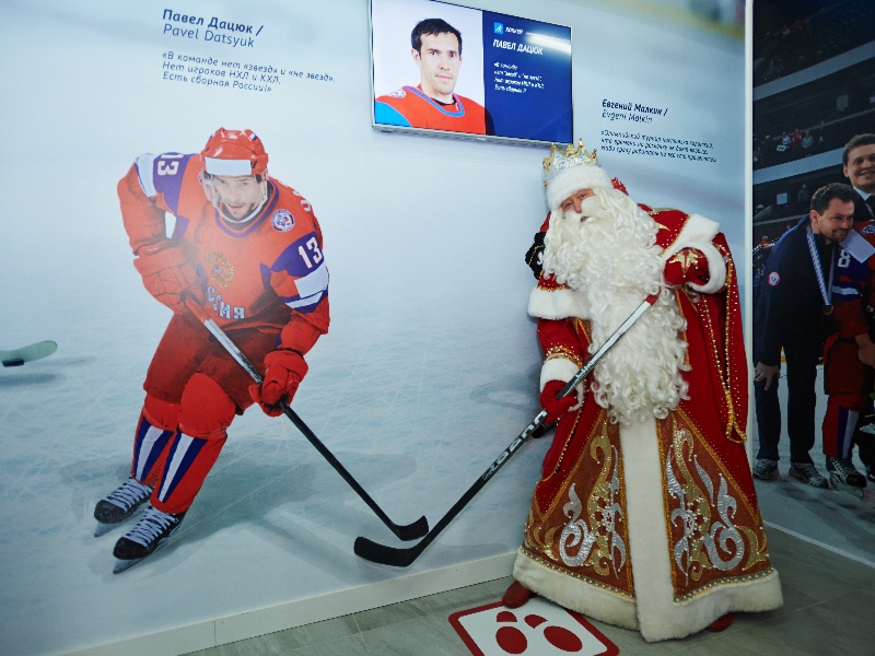 Дед Мороз в первых рядах посетил Дом Болельщиков Олимпийской команды России, где будут проходить прямые трансляции соревнований и встречи со спортсменами. Там зимний волшебник посмотрел выставку с амуницией российских олимпийцев с последних Зимних Игр. В первую очередь внимание Деда Мороза привлекли бобслейные сани, на которых Александр Зубков и Алексей Воевода выступали на Зимних Играх в Ванкувере. После зимний волшебник остановился у стенда, который посвящен хоккею. Там он и ненадолго оставил свой посох и взял в руки хоккейную клюшку Павла Дацюка.