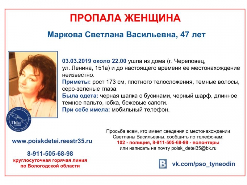 В Череповце волонтеры и полиция ищут пропавшую женщину. По информации поисково-спасательного отряда «Ты не один», 47-летняя Маркова Светлана Васильевна ушла из дома на улице Ленина, 151а около 10 часов вечера 3 марта, с тех пор о ней нет никаких известий.