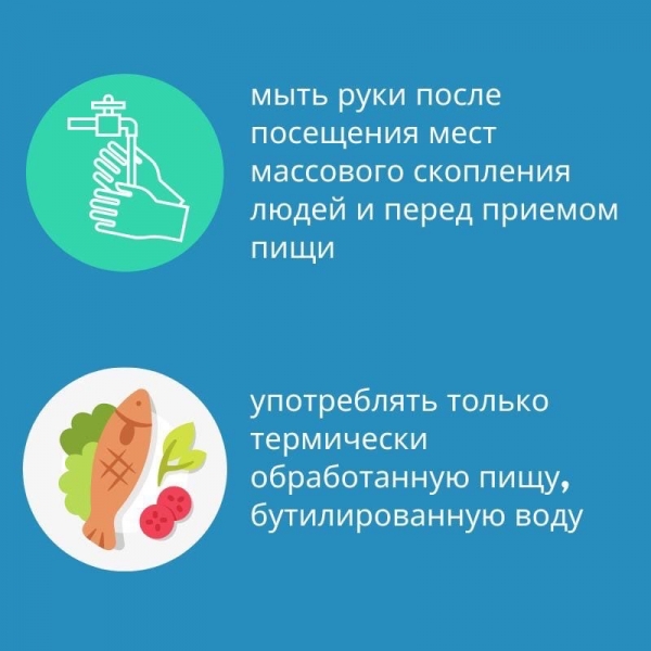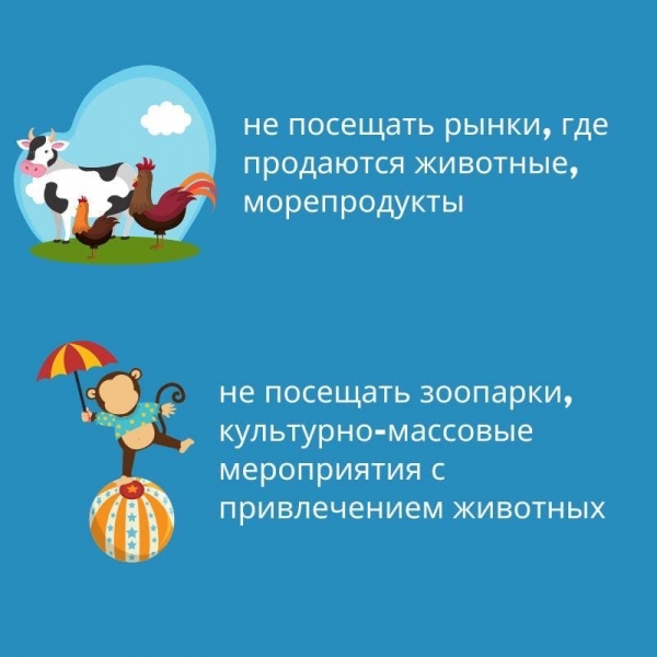 Находясь за пределами страны, старайтесь не покупать продукты животного и морского происхождения на рынках. Употребляйте пищу после термической обработки, а воду пейте только из бутылок.