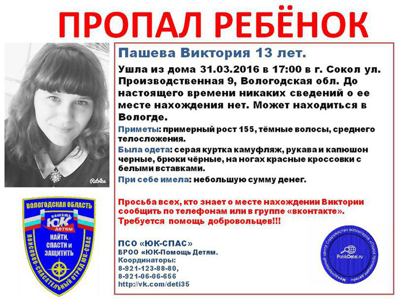 Отметим, что школьница может находиться в Вологде. Все, у кого есть какая-либо информация о местонахождении девочки, просим сообщить координаторам ПСО «ЮК-СПАС» по телефонам 8-921-123-88-80 и 8-921-06-06-656 или сотрудникам полиции по номеру 02.