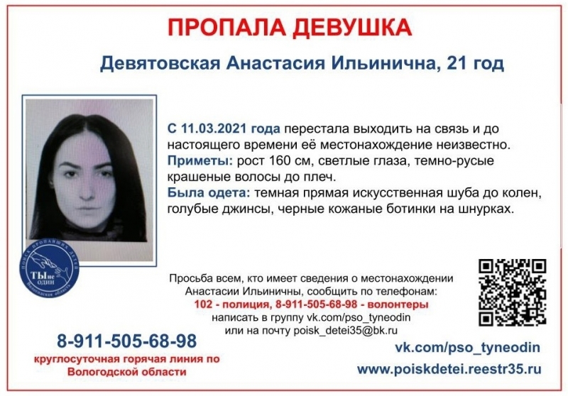 21-летняя Анастасия Девятовская перестала выходить на связь с 11 марта. Сейчас местонахождение череповчанки неизвестно. К поискам подключились волонтеры.