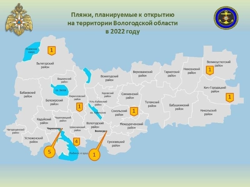 Стоит отметить, что пляжи будут оборудованы не в каждом районе. Больше всего порадуются череповчане, в городе в планах открыть сразу 5 пляжей, 4 территории будет сделано в Шекснинском районе, по одному в Вытегорском, Кирилловском, Сокольском, Великоустюгском Кич-Городецком и в Вологде, сообщает ИА «СеверИнформ».