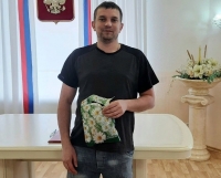 Счастливому отцу вручили документы о рождении. Приятным подарком стали носочки, связанные неравнодушными горожанами.