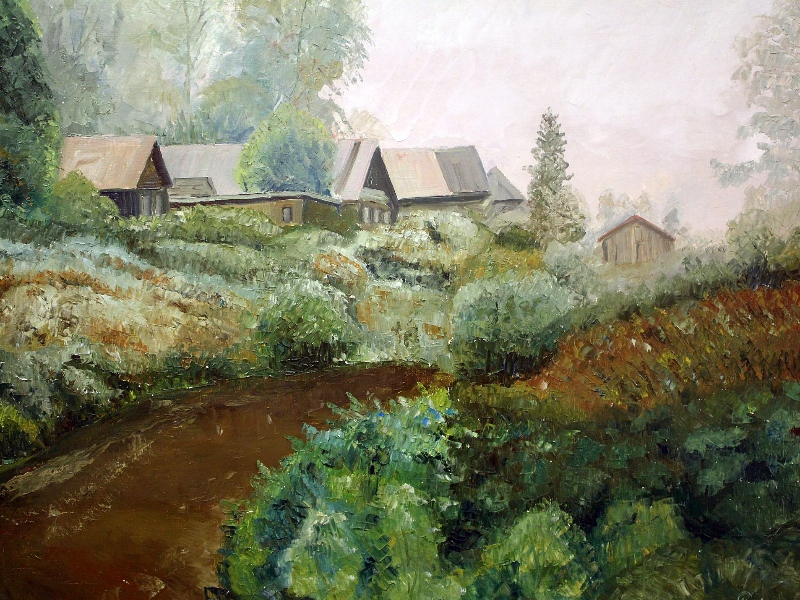 Мастер изображает не только природу, но и родной город, пишет Тотьму и ее окрестности. В его видовых пейзажах узнаются уютные дома, узкие улицы и оригинальные по своей архитектуре храмы Тотьмы.