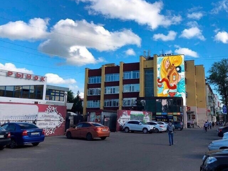 Панно в духе русских народных сказок появится на доме на улице Батюшкова, 7. Здание возле городского рынка в Вологде уже украшает "девушка с колобком". Росписью занимается 20-летний уличный художник Дмитрий Аксютенко. Он приехал к нам из Симферополя. Автор панно начал работу поздним вечером в пятницу, 5 июля. На создание всей картины, по предварительным оценкам, уйдет около трех дней.
