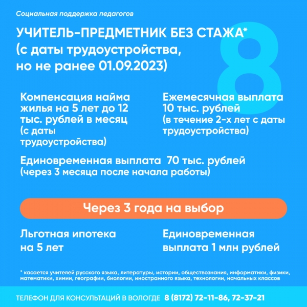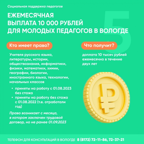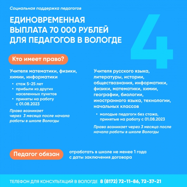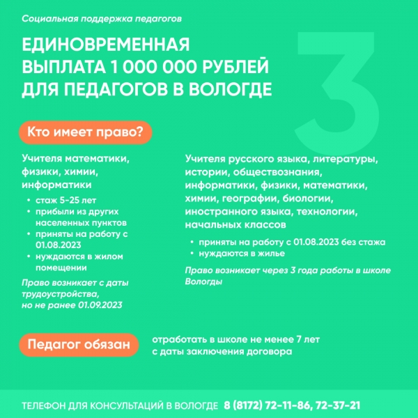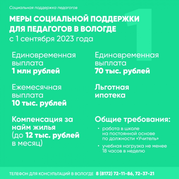 «Мы заинтересованы в стажерах, которые готовы приехать из других городов и регионов, и в выпускниках вузов. В большинстве случаев мерами поддержки смогут воспользоваться учителя, принятые на работу с 1 августа 2023 года. Исключение составят только молодые педагоги. Они выплату смогут получать как новички, так и те, кто уже отработал год в школе. На нее теперь могут рассчитывать и работающие в школе студенты IV-V курсов. Этот стаж не будет учитываться для получения мер поддержки, то есть они будут считаться заново принятыми на работу после вуза», - пояснил мэр Вологды Сергей Воропанов.