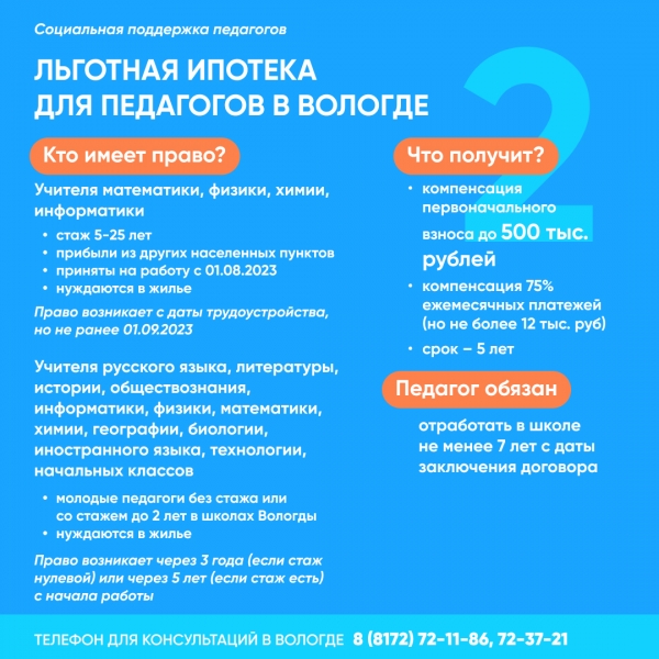 «Для каждой меры поддержки необходимо собрать свой пакет документов, но в целом во всех случаях алгоритм общий, достаточно простой и прозрачный. Сначала педагог заключает договор с образовательным учреждением, куда пришел работать, после чего обращается к руководителю с ходатайством о получении той или иной меры поддержки. Директор школы должен согласовать это ходатайство с управлением образования, затем пакет документов нужно подать в управление опеки и попечительства Вологды по адресу: Советский проспект, 24», - рассказал Сергей Воропанов.