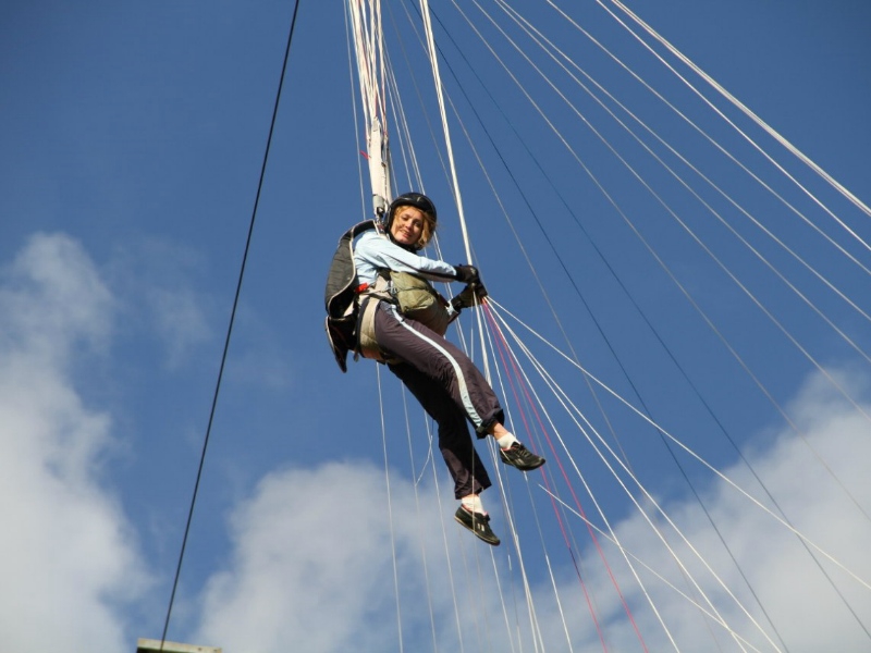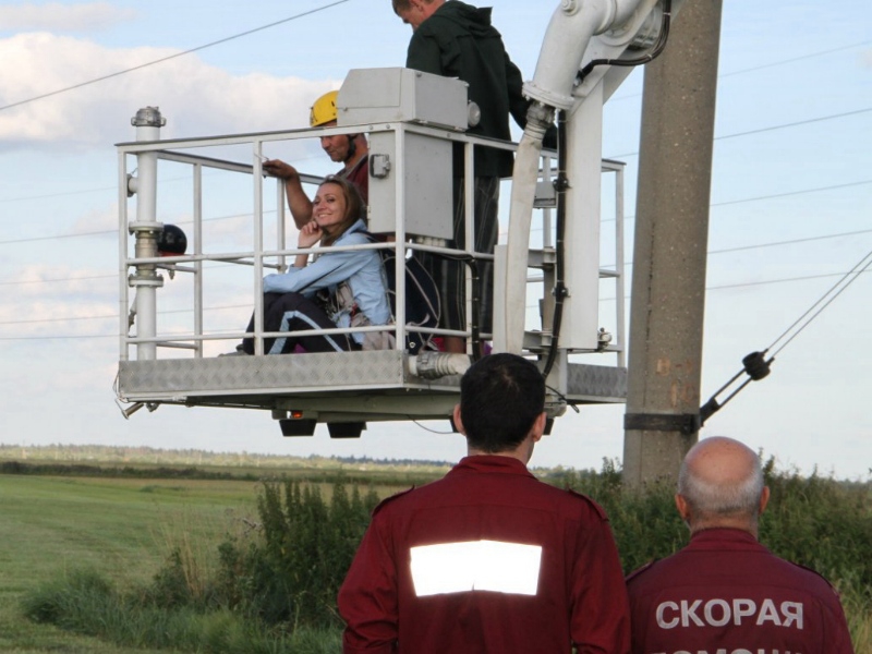 «С площадки приземления меня снесло сильным ветром, и я повисла на проводах, - рассказала вологжанка. - Машина, которая всегда забирает нас с площадки, через 5 минут проехала мимо. Я помахала им рукой, что у меня все в порядке. Они поехали на аэродром вызывать все соответствующие службы. После этого, минут через 15, ко мне подъехали наши ребята и до последнего момента находились со мной, не уезжали. Линию, на которой я повисла, отключили. Примерно через полчаса приехала «скорая», за ней МЧС. Но меня снять не смогли, так как лестница у них для таких случаев не предназначена. Пришлось вызывать кран. Он приехал еще минут через 30-40 и простоял еще 20 минут без движения. Потом ветер усилился, меня стало стаскивать, и я заругалась, что меня чересчур долго снимают. Снимал меня наш инструктор, с аэродрома».