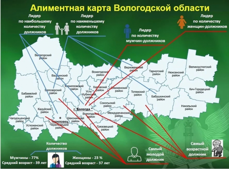 Самым молодым алиментщикам региона – 19-21 год. Они живут Вологодском, Белозерском и Кадуйском районах. В Вологодском районе, а также Сокольском и Тотемском зарегистрированы наиболее старшие должники – им от 71 до 85 лет.