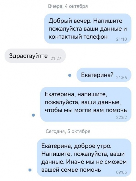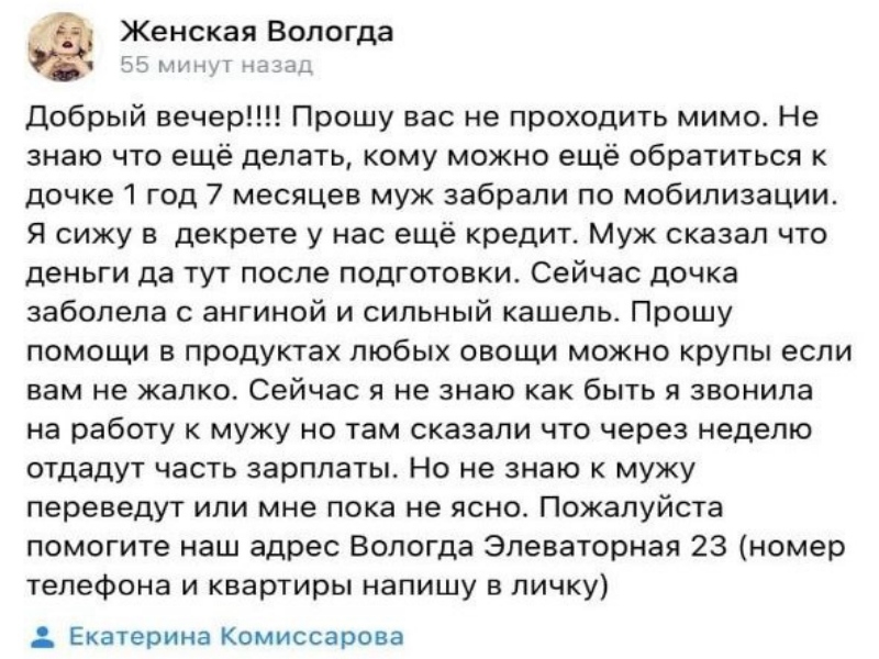Автор сетовала, что мужа призвали, она в декрете с маленькой дочкой, ребенок заболел ангиной, денег нет. Просила помочь продуктами и обещала назвать точный адрес и телефон в личном сообщении. Но при переписке вдруг переставала отвечать. В диалог с Екатериной Комиссаровой вступил и мэр Вологды Сергей Воропанов, которому тоже прислали ссылкой на пост. Оказалось, что аналогичные душещипательные истории случились одновременно в нескольких российских городах.