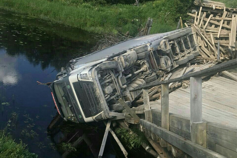 Дело было летом 2018 года в Вытегорском районе. У деревни Исаево водитель фуры, забитой пиломатериалами, выехал на деревянный мост через Индомарку. При этом полностью проигнорировал знак ограничения грузоподъемности 3,5 тонны. Мост не выдержал грузовика. Прямо посередине реки конструкция ушла под воду, а фура, превышающая позволенный вес в несколько раз, легла на бок. Водитель отделался испугом.