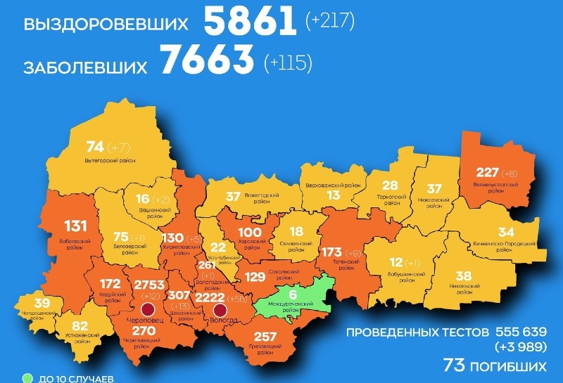 Региональный департамент здравоохранения проинформировал о текущем положении дел в области. Итак, за прошедшие сутки заболело 115 человек. Тут безоговорочный лидер город Вологда - 56 подтвержденных случаев. Далее: 13 – Шекснинский район, 12 – Череповец, 9 – Тотемский район, 8 – Великоустюгский район, 7 – Вытегорский район, 5 – Кирилловский район, 2 – Вашкинский район, по одному в Белозерском, Бабушкинском и Вологодском районах.