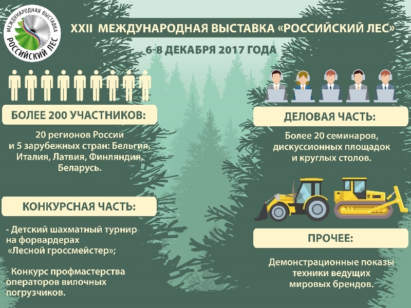 В течение трех дней участники выставки обсудят вопросы борьбы с несанкционированными свалками в лесах, рассмотрят новые подходы к ценообразованию на продукцию лесного комплекса и многое другое. Два дня, 6 и 7 декабря, в ВК «Русский Дом» будет работать профориентационная площадка для старшеклассников – ярмарка лесных профессий. Зрелищным мероприятием второго дня станет конкурс профессионального мастерства на вилочных погрузчиках, - сообщает ИА «СеверИнформ».