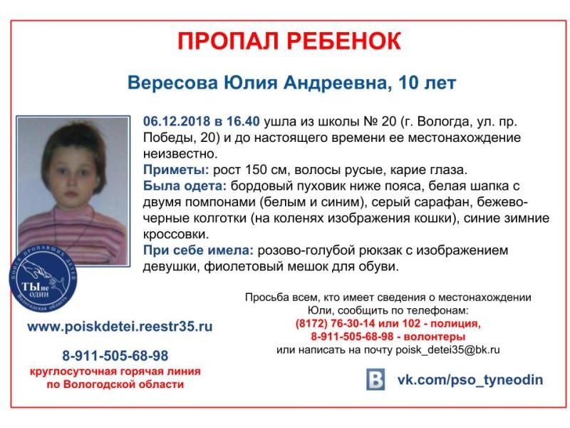 Вологжан просят обращать внимания к прохожим детям в общественных местах. Любую информацию о местонахождении девочки можно сообщить по телефонам полиции 8-8172-76-30-14 и 102, или волонтерам 8-911-505-68-98, сообщает ИА «СеверИнформ».