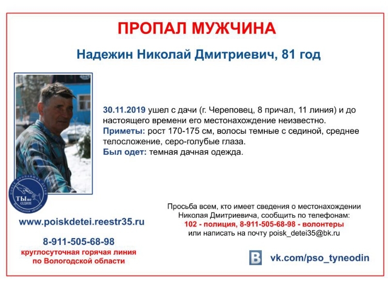 Всем, кто располагает информацией о местонахождении череповчанина, просьба позвонить по указанным в ориентировке телефонам, сообщает ИА "СеверИнформ".
