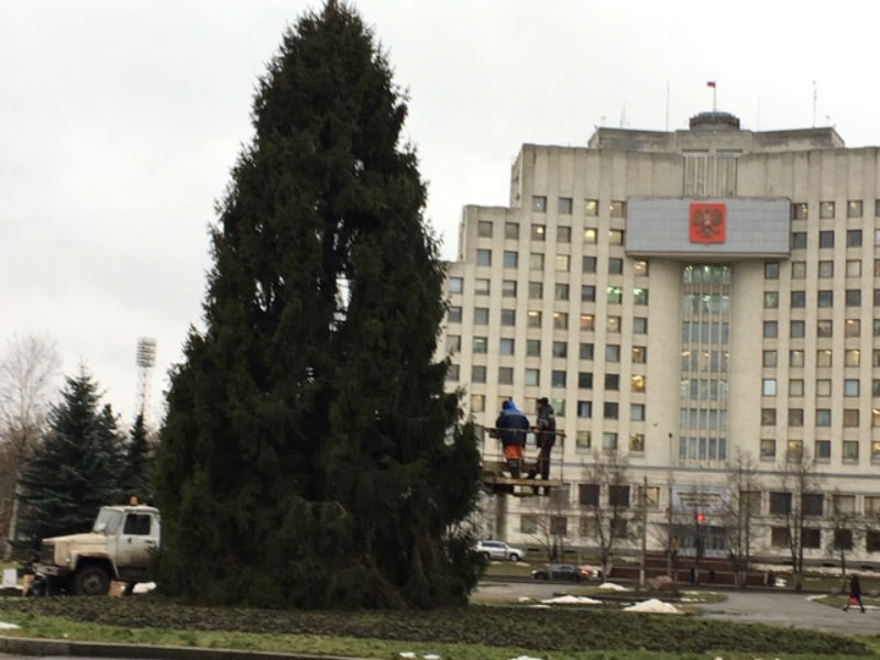 Так уж получилось, что по периметру площади почти в центре города находятся здания правительства Вологодской области, городской Думы и администрации, а также Законодательного собрания. То есть, ель, традиционно устанавливаемая на центральной клумбе площади, видна из окон рабочих кабинетов чиновников и депутатов, что должно навивать мысли о предстоящих праздниках. Кстати, в этом году она живая, в высоту более 10 метров и довольно пушистая. Рабочие, украшающие дерево шарами и гирляндами, сказали, что росла елка недалеко от города.