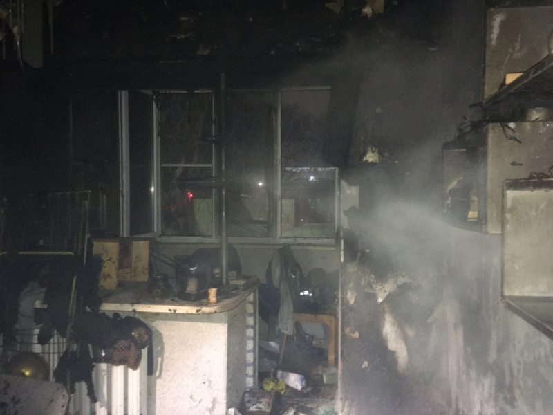 Огнём повреждена внутренняя отделка кухни; квартира закопчена практически по всей площади.