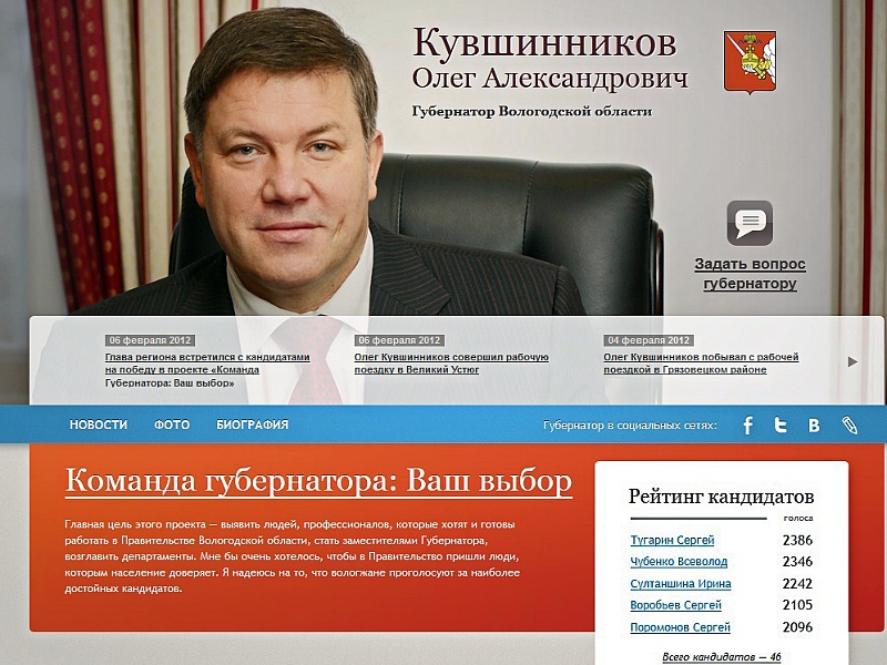 Напомним, проект стартовал 16 января. За три недели анкеты нескольких сотен кандидатов проходили отбор на нескольких этапах. Предварительные лидеры определились по результатам Интернет-голосования на сайте www.okuvshinnikov.ru и обсуждения экспертными группами. Завершающим стало уличное голосование в Вологде, Череповце и районных центрах. В итоге на каждую из 14 вакантных должностей претендуют 3 кандидата.
