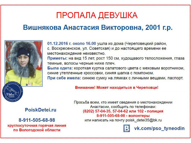 Напомним, школьница ушла из дома в селе Вознесенское Череповецкого района 1 декабря около 16 часов, до настоящего времени её местонахождение было неизвестно.