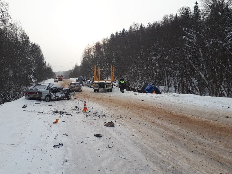 Как сообщает региональное УМВД, спровоцировал аварию погибший водитель ВАЗа 2115. 64-летний мужчина не справился с управлением и выехал на полосу встречного движения. В этот момент по «встречке» двигался КАМАЗ с прицепом. В результате столкновения с большегрузом, ВАЗ отбросило в сторону, где он ударил еще один автомобиль - Шевроле Ланос, за рулем которого находилась 37 летняя женщина. КАМАЗ после столкновения съехал в кювет. В результате инцидента смертельную травму получил водитель ВАЗА, сообщает ИА «СеверИнформ».
