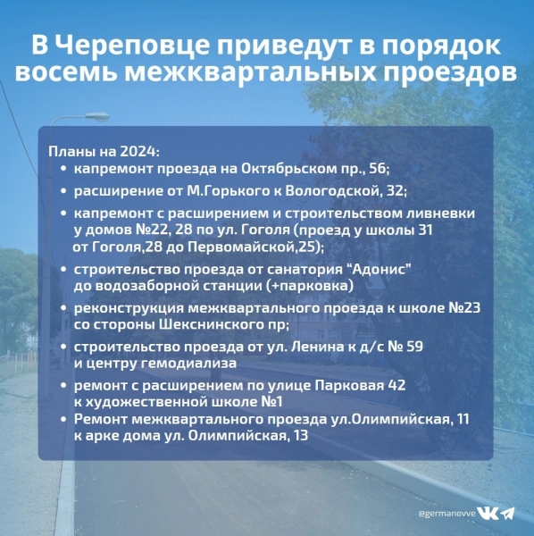 «Родителям воспитанников садов № 90 и 81 понравятся планы расширения от Горького до Вологодской, жители «Черемушек» давно просили расширить дорогу у домов по Шекснинскому пр. 8, 10, 16 и 18 к школе № 23. Реконструкция пройдет и на проезде от поликлиники медсанчасти к художественной школе № 1 на Парковой, а также от Гоголя до Первомайской мимо школы № 31», - рассказал мэр Вадим Германов.