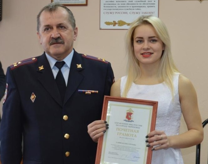 Начальник УМВД России по Череповцу Владимир Иванов вручил почетную грамоту 17-летней Елене Талицкой
