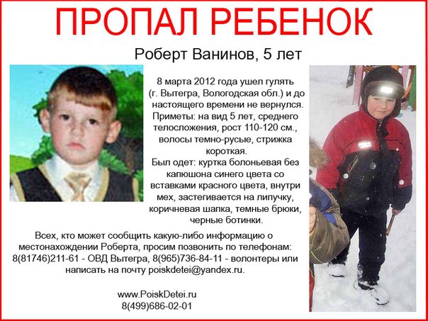 Так или иначе, следователи обращаются ко всем, кто мог быть с 23-х часов до полуночи недалеко от указанного места, сообщить в следственный отдел по Вытегорскому району или в дежурную часть отдела МВД по Вытегорскому району по телефонам 2-11-02 и 2-14-05. Напомним приметы Роберта Ванинова. Это мальчик пяти лет среднего телосложения, рост его 110-120 сантиметров, волосы темно-русые, стрижка короткая. Роберт был одет в болоньевую куртку без капюшона синего цвета с красными вставками и мехом внутри, коричневую шапку, темные брюки, черные ботинки.