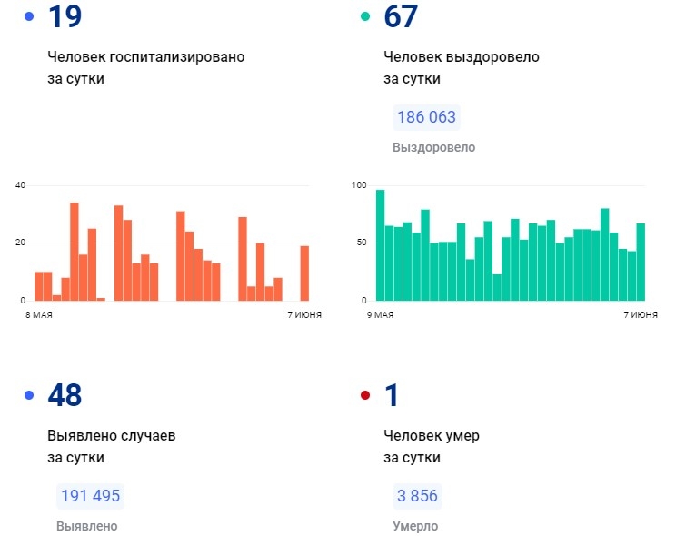 За последние сутки отрицательный тест получили 67 человек. Новых случаев зарегистрировано 48. С начала пандемии диагноз подтвердился более 191,4 тысячи раз.