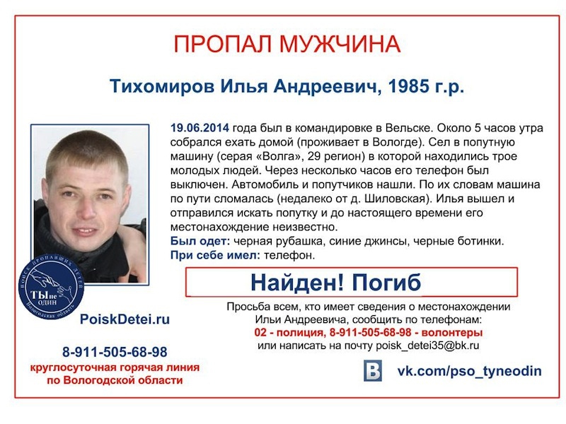 Напомним, по информации ПО "Ты не один", 29-летний Илья Тихомиров находился в командировке в Архангельской области. Он пропал, когда возвращался в Вологду из Вельска.