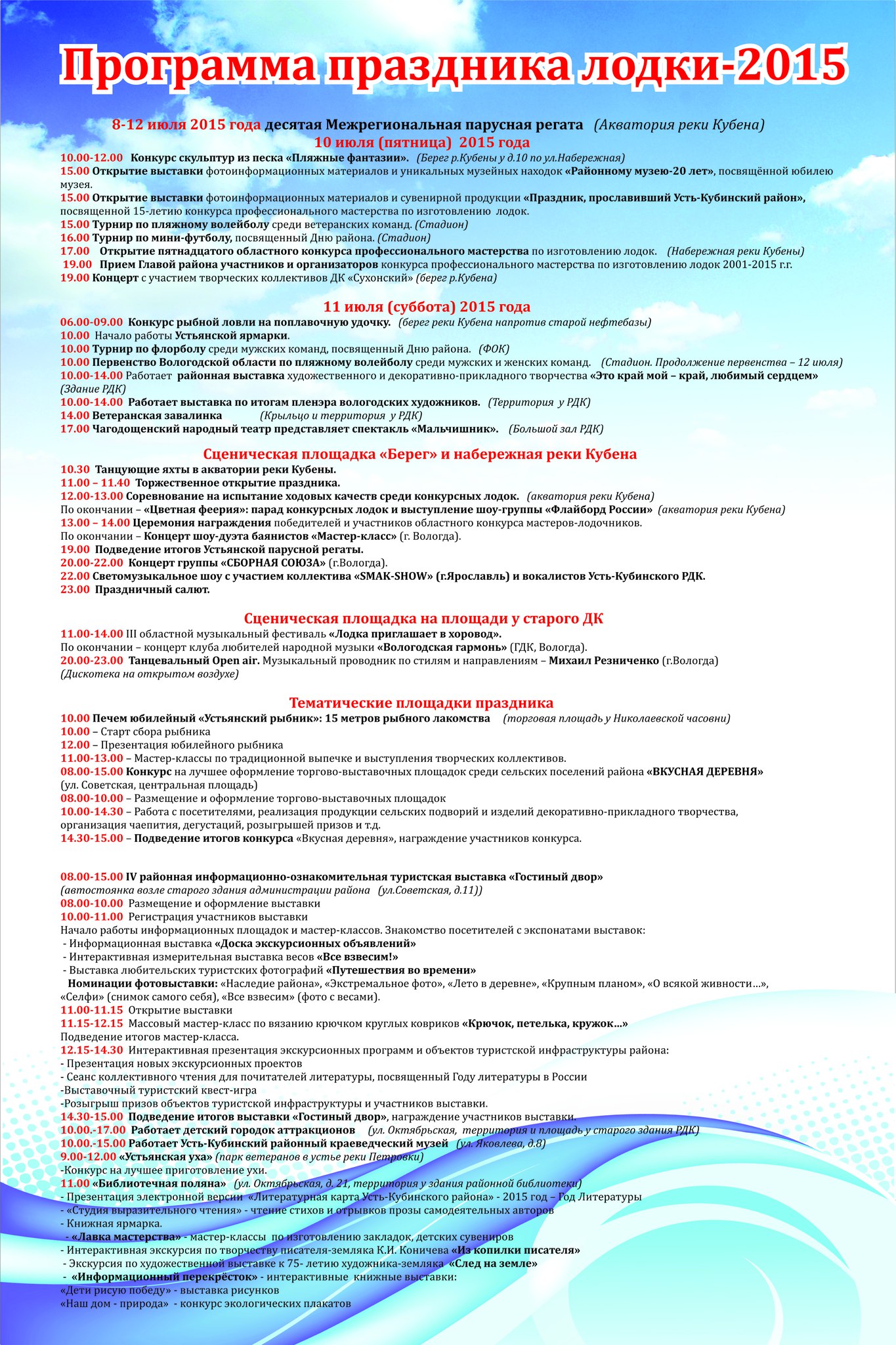 Центральным событием праздника по традиции станет конкурс мастеров-лодочников. Его торжественное открытие состоится 8 июля в 17:00 на набережной реки Кубены. За звание лучшего лодочника вновь поборются профессионалы и любители, мастера, посвятившие этому ремеслу всю жизнь, а также совсем молодые специалисты.