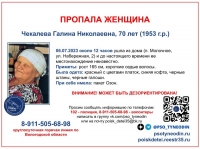 Приметы пенсионерки: короткие седые волосы, невысокая, на голове красный платок с цветами. Была одета в синюю кофту, на ногах галоши. При себе могла иметь пакет с логотипом Озона.