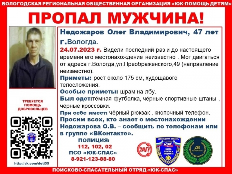 47-летний житель Вологды ушел 25 июля с адреса Преображенского, 49. На следующий день пытался связаться с родными по телефону, но не смог объяснить, где находится. С тех пор мобильный отключен. Мужчина нуждается в медицинской помощи.