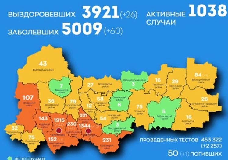 Выздоровели 3921 человек, в том числе за сутки 26. Тест сдали более 453 тысяч вологжан, сообщает ИА "СеверИнформ".