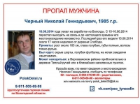 Николай Черный уехал на заработки в Верховажский район и исчез. На связь с родственниками он не выходил с 16 июня. В последний раз его видели легко одетым ночью в середине июля на дороге между деревнями Истопочная и Теплый ручей.
