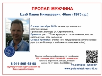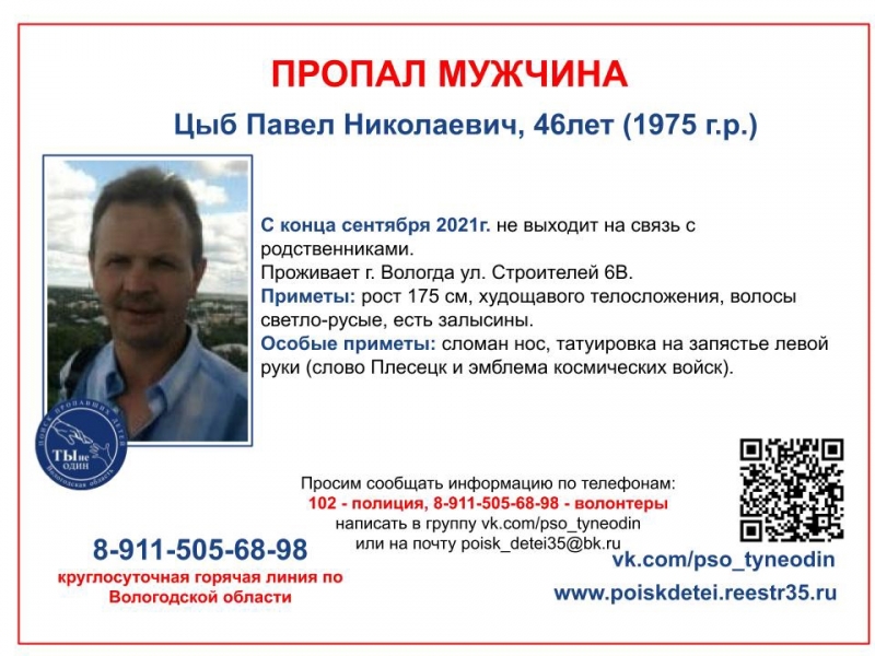 46-летний Павел Цыб уже больше 2 месяцев не выходит на связь с родственниками. Мужчина живет в Вологде на улице Строителей, 6В. ПСО «Ты не один» распространяет ориентировку о поиске.