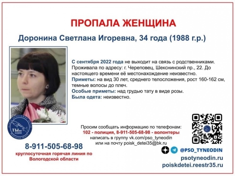 ПСО «Ты не один» публикует приметы череповчанки. Она выглядит моложе своего возраста, ростом 160 сантиметров, темные волосы до плеч. Из особых примет — татуировка в виде розы над грудью. Во что была одета, неизвестно. Всех, кто знает что-то о судьбе девушки, просьба позвонить в полицию или волонтерам на горячую линию.