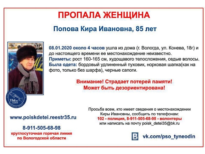 Беспокойство родственников было связано с тем, что пожилая женщина страдает потерей памяти. Чтобы с дезориентированной вологжанкой ничего не случилось, требовалось срочно ее найти.