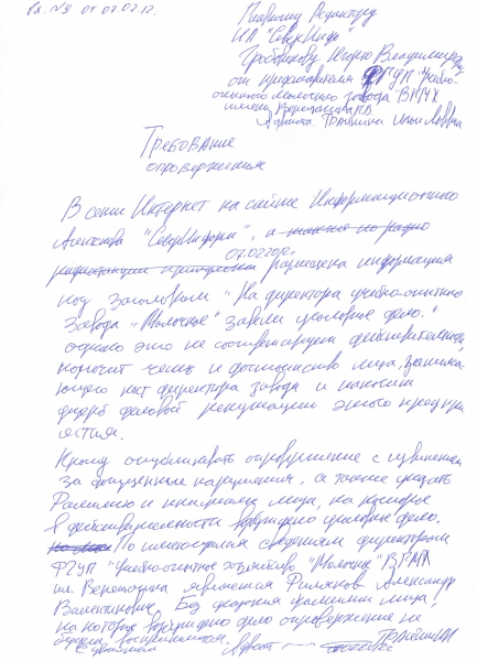 Редакция ИА "СеверИнформ" информирует о том, что 7 февраля 2012 года на Интернет-сайте агентства была допущена неточность при размещении информационного сообщения "На директора учебно-опытного хозяйства "Молочное" завели уголовное дело". Первоначально по вине сотрудников агентства в указанном заголовке вместо слова "хозяйство" было употреблено слово "завод". Удовлетворяя требование об опровержении, поступившее от представителя ФГУП "Учебно-опытный молочный завод" Вологодской государственной молочнохозяйственной академии имени Н.В. Верещагина" (копию требования прилагаем), редакция сообщает, что информационный материал необходимо читать в следующей редакции:
