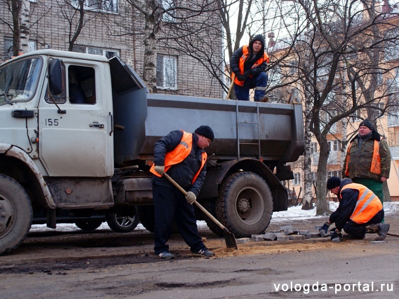 Ямочный ремонт выполнен на 1200 квадратных метрах дорог в Вологде. Рабочие укладывают брусчатку. По словам специалистов, этот метод соответствует погодным условиям.