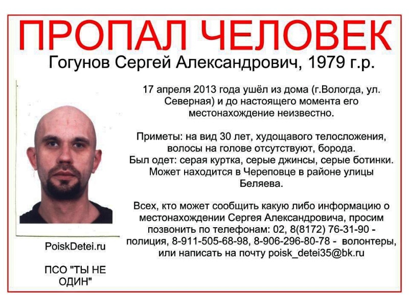 Пропавшего мужчину ищут в Вологде. 33-летний Сергей Гогунов ушел из дома на улице Северной еще 17 апреля. С тех пор о его местонахождении ничего не известно. Предположительно, мужчина может находиться в городе металлургов в районе улицы Беляева. Вологжанина ищет полиция и волонтеры.