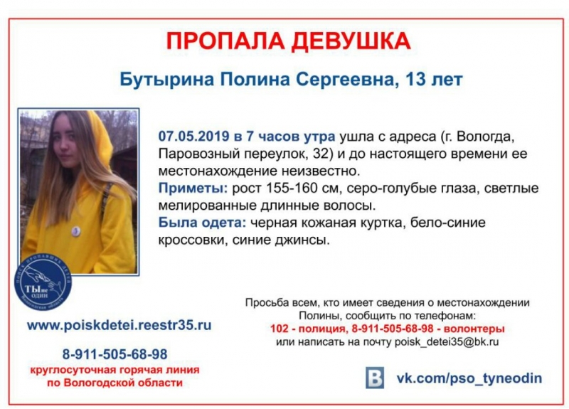 Пропавшую школьницу из Завокзального микрорайона разыскивают в Вологде волонтеры и полиция. По информации поисково-спасательного отряда «Ты не один», 13-летняя Полина Бутырина ушла из дома на Паровозном переулке, 32 вчера, 7 мая, около семи утра. С этого момента о ней ничего не известно.