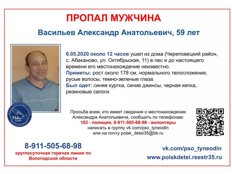 59-летний Александр Васильев ушел в лес около полудня 6 мая. Мужчина живет в селе Абаканово. С тех пор ничего неизвестно о местонахождении мужчины. Волонтеры ПСО "Ты не один" объявили сбор на поиски.