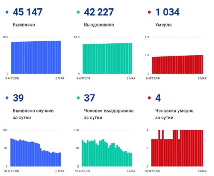 В Вологодской области на утро сегодняшнего дня, 8 мая, вновь, как и ранее (13-й день подряд), статистика зафиксировала четыре смерти среди пациентов с коронавирусом за сутки. Число новых случаев заболевания — 39, выздоровлений — 37. Днем ранее эти цифры, приведенные на стопкоронавирус.рф, располагались в обратном порядке.