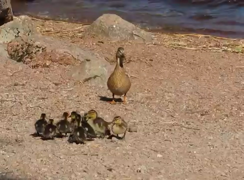 В Выборгском районе Ленинградской области прохожие сняли первый выводок утят. Мама-утка учит самостоятельности десять пушистых птенцов - плавать, добывать пищу и прятаться от врагов.