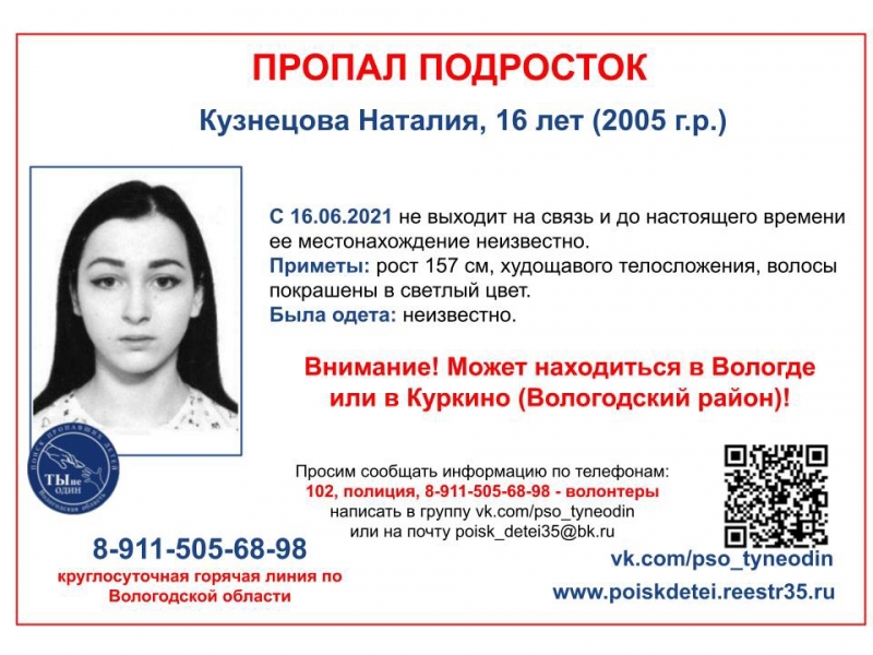 Наталия Кузнецова не выходит на связь с родственниками с 16 июня. До сих пор неизвестно, где сейчас находится подросток. ПСО «Ты не один» присоединился к поискам.