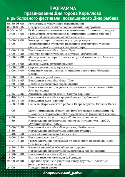Фестиваль станет частью программы, посвященной Дню города. Вечером Кириллов озарит праздничный фейерверк, сообщает ИА «СеверИнформ».